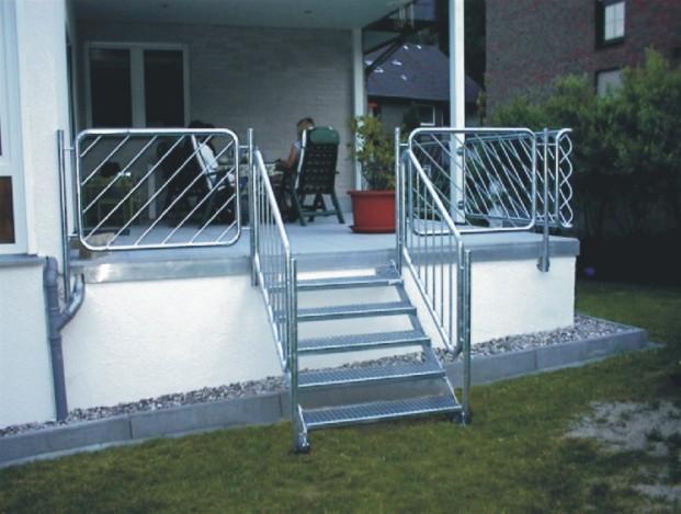 Geländer aus Rundrohr, Pfosten und Querstreben aus Rundmaterial. Gesamtes Material feuerverzinkt.