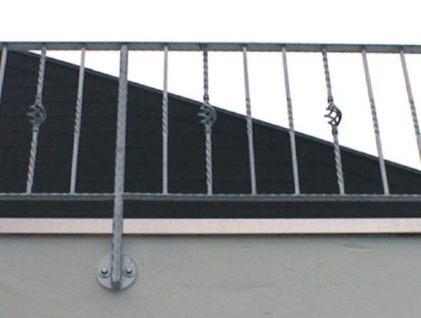 Geländer aus geschmiedetem Handlauf, Stäbe und Untergurt. Zierstäbe mit Zwirbel und Füllstäbe mittig gedreht. Gesamtes Material feuerverzinkt.