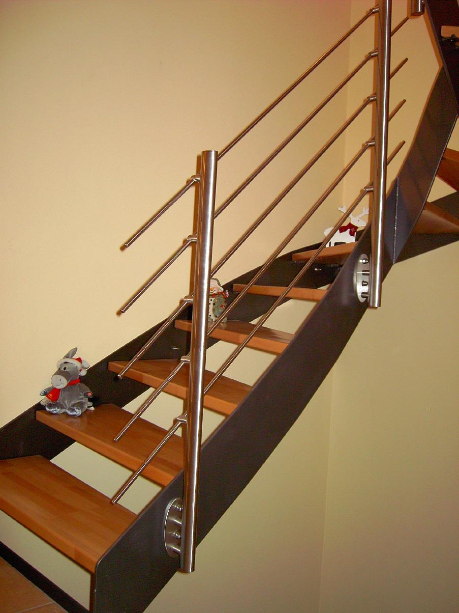 Treppenholm aus Quadratrohr 40x40x2 mm. Stufen aus blockverleimten Ahornholz. Kanten gerundet und zweimal lackiert. Geländer nicht notwendig, da die Treppe in einer Nische eingebaut wurde.
