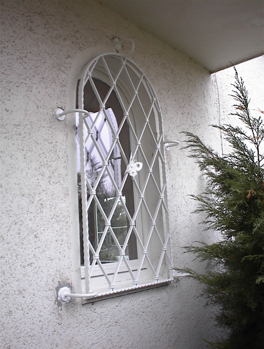 Rahmen aus gehämmerten Flachstahl 30 x 10 mm, Rautenfüllung aus Flachstahl 12 x 6 mm, Rautenverbindungen aus Bundeisen 20 x 4 mm, Wandanker aus Rundstahl Ø 16 mm gehämmert. Mit 2 Komponentenharz im Mauerharz verklebt. Schmetterlinge wurden aus altem Fenstergitter übernommen, sandgestraht und an neuem Gitter verschweißt.