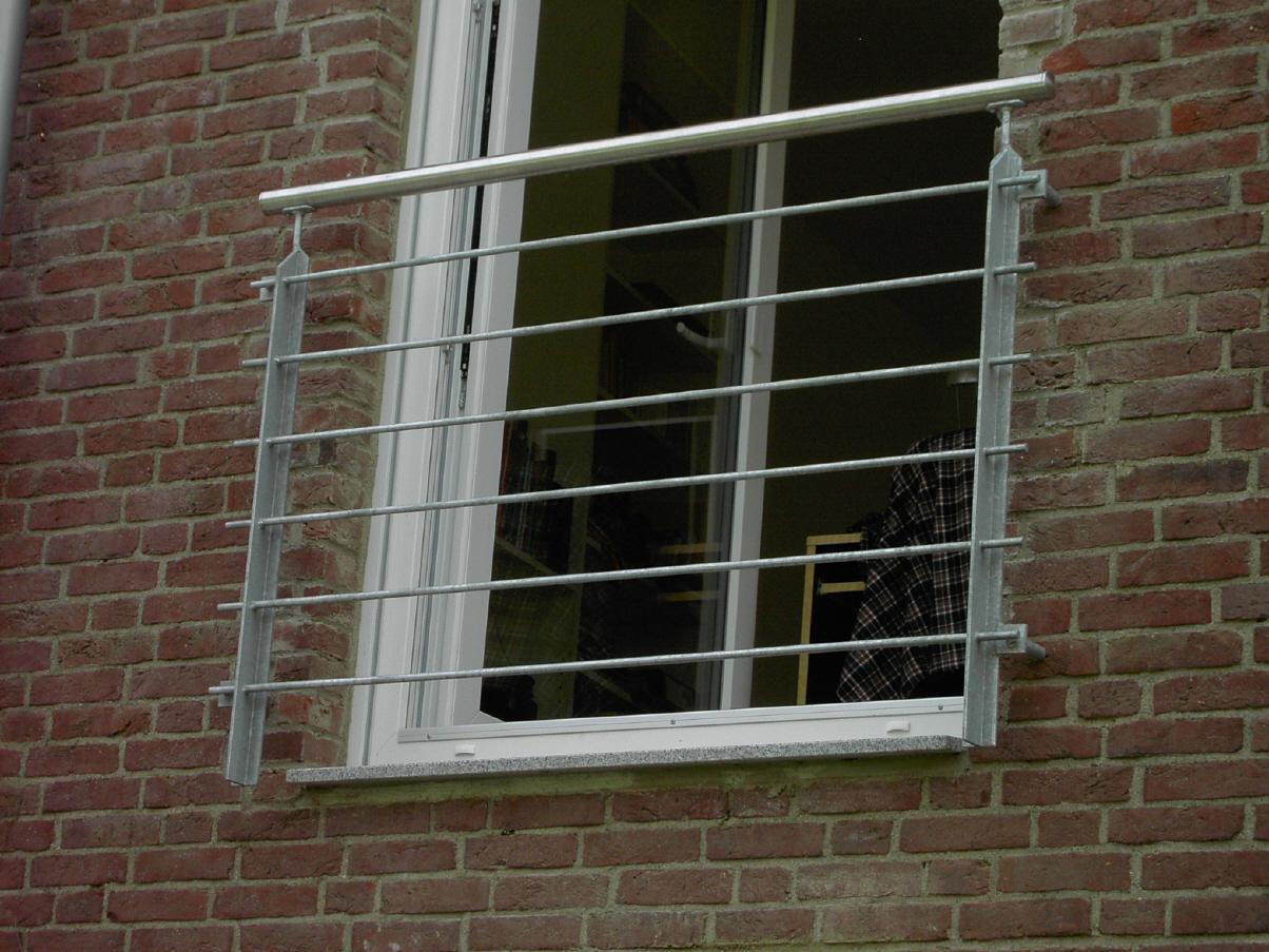 Fesnstergitter aus T 50 Stahl mit 6 waagrechten Füllstäben Ø 12 mm, mit abgesetztem Handlauf aus Edelstahl.