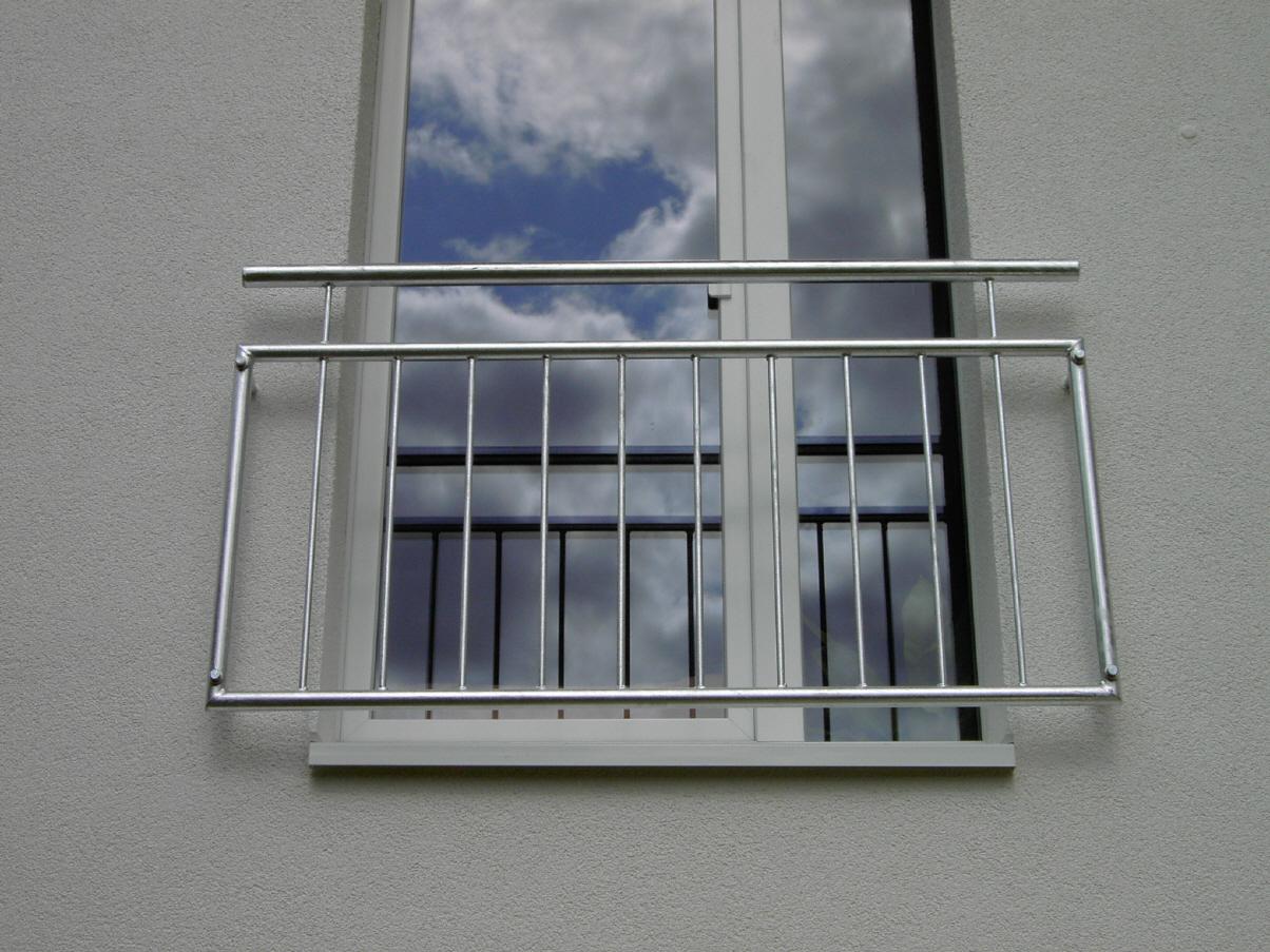 Rundrohrrahmen Ø 33,7 mm. Senkrechte Füllstäbe Ø 12 mm. Handlauf abgesetzt auf 12 cm langen Rundeisenstiften Handlaufdurchmesser 42,4 mm.