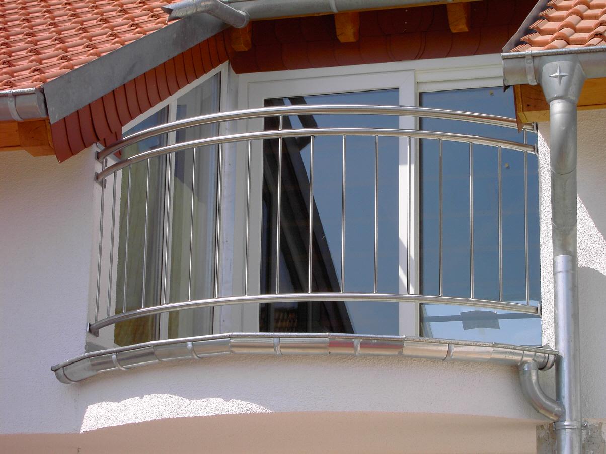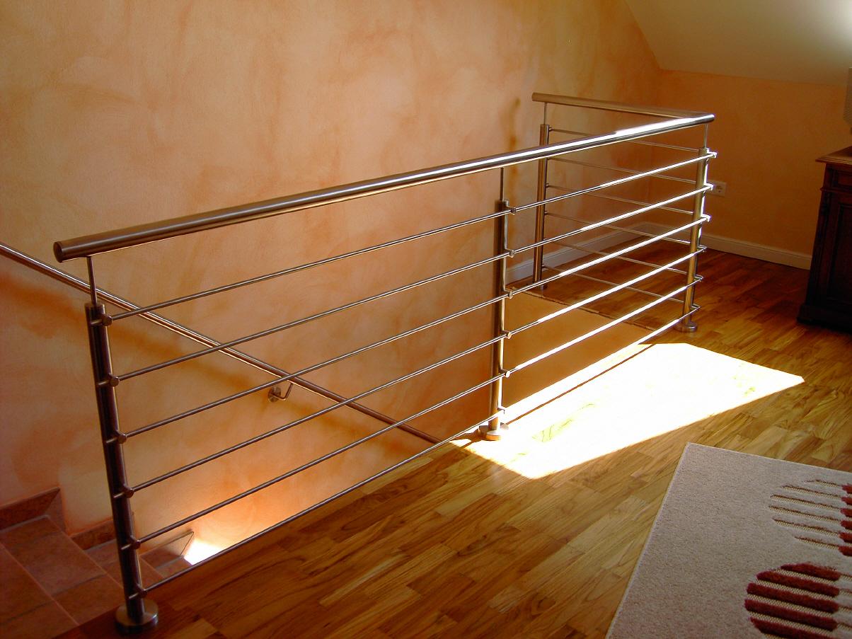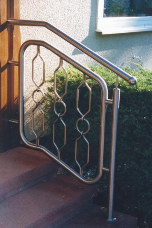 Handlauf, Rahmen und Pfosten aus Rohr. Füllungen aus Rundmaterial, gebogen und verschweißt. Gesamtes Material Edelstahl gebürstet - Korn 240.