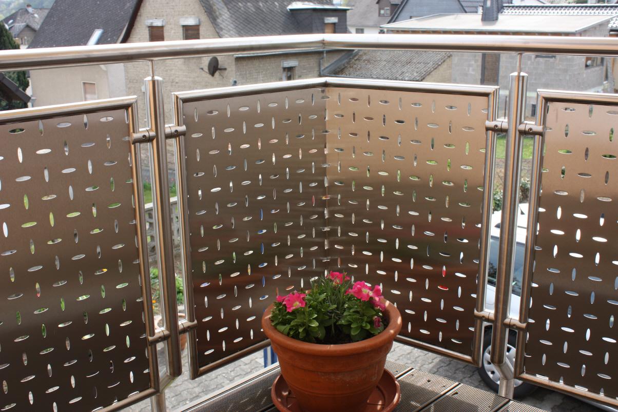 Rundrohrpfosten Ø 42,4 mm abgesetzter Handlauf Ø 42,4 mm Lochblechfelder Einfaßprofile Ø 27 mm mit 1,5 mm dickem Edelstahllochblech