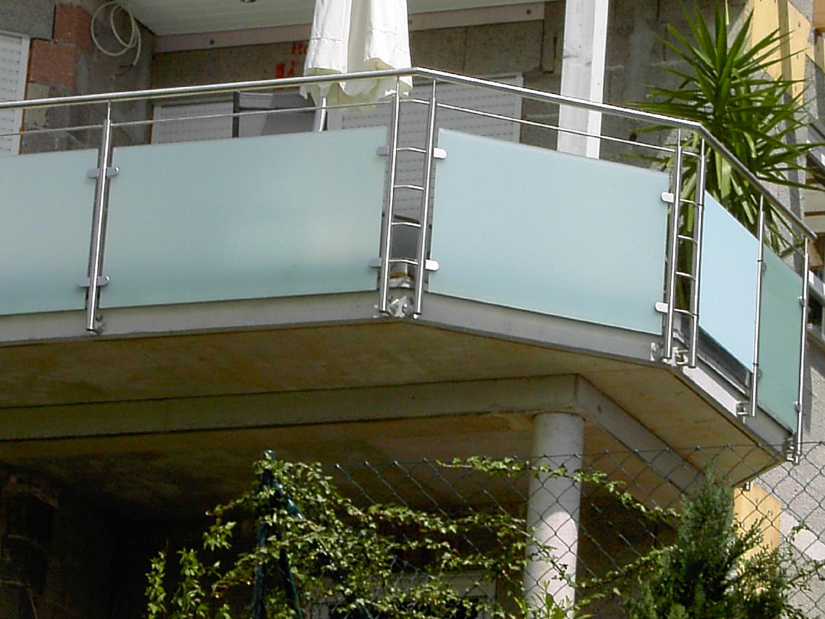 Pfosten und Handlauf aus Rundrohr Ø 42,4 mm Querstrebe und Pfostenverbindungen aus Rundstahl Ø 12 mm Füllungen aus satiniertem VSG-Glas 10 mm Glasbefestigung aus Edelstahl 2-teilig