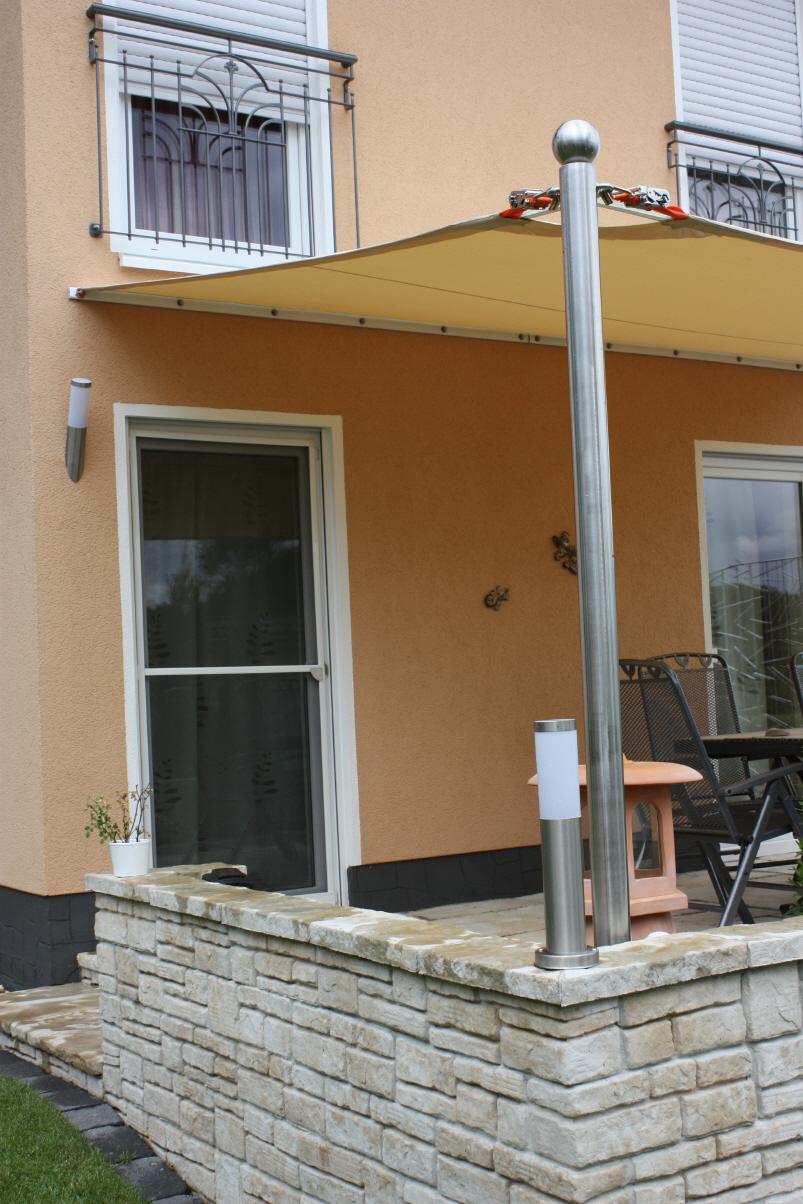 Stütze für Sonnensegel aus Rundrohr Ø 80 mm 3 m lang mit aufgeschweißtem Deckel und Edelstahlabschlusskugel Ø 100 mm Zurrösen Ø 30 mm