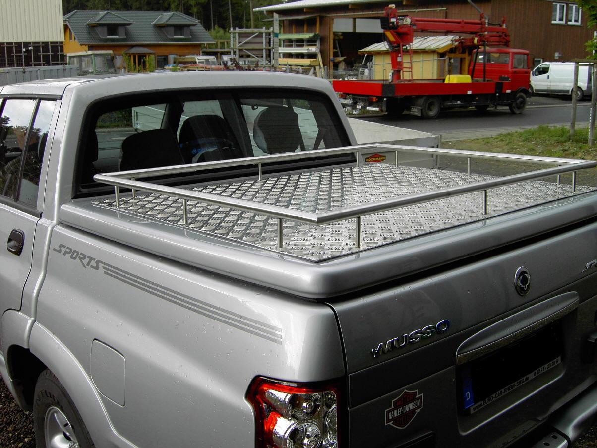 Rahmen aus 30 x 30 mm Quadratrohr, Auflageblech aus Aluminiumquintettblech 2,5 mm dick, zusätzlich Edelstahlreeling.