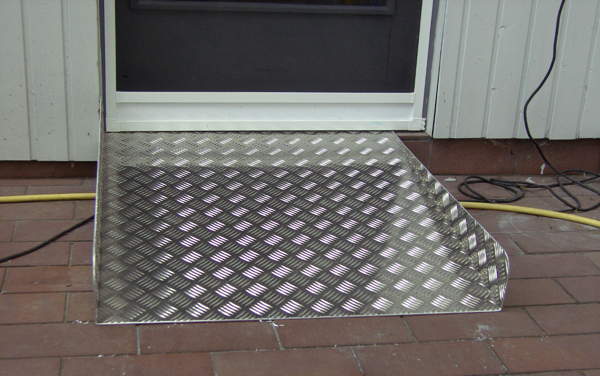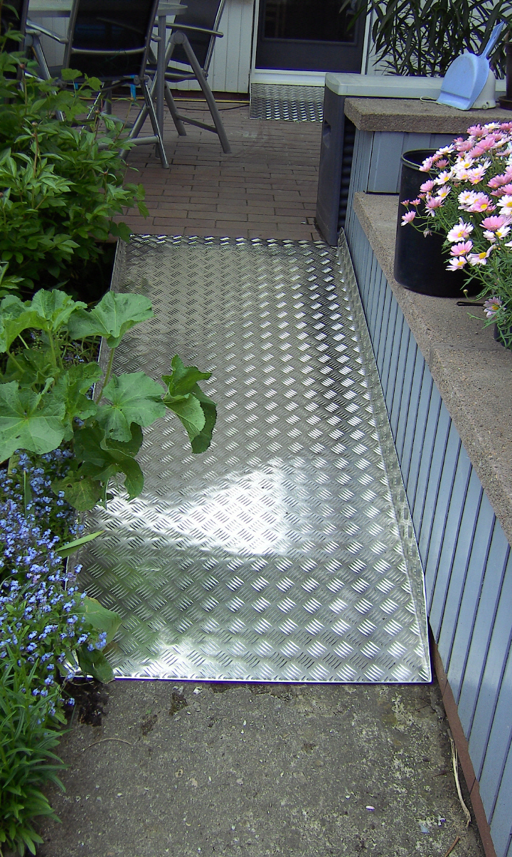 Behindertenrampe aus Aluminiumriffelblech, Seiten nach oben gekanntet zur Stabilisierung.Unterkonstruktion aus Aluminiumquadratrohr 50 x 50 x 3 mm. Material:Aluminiumquintettblech, Grundstärke 3,5 mm mit Riffel 5 mm