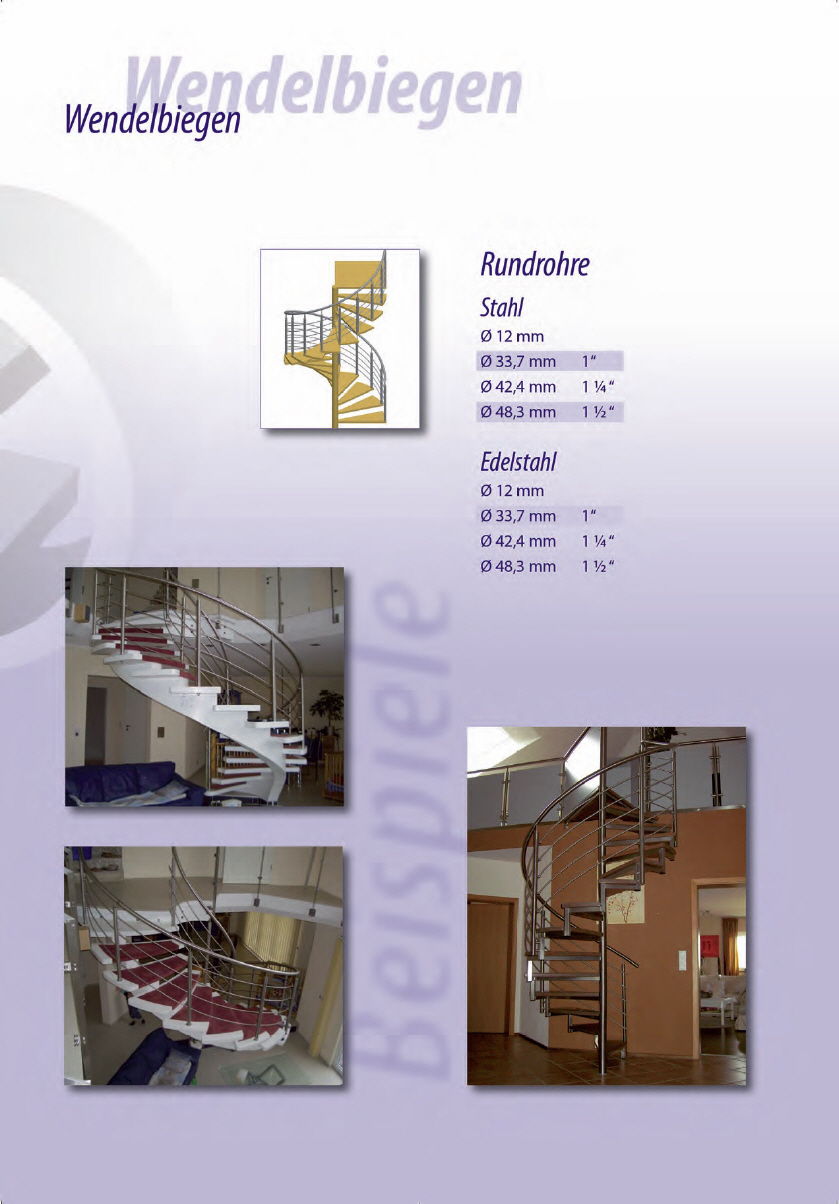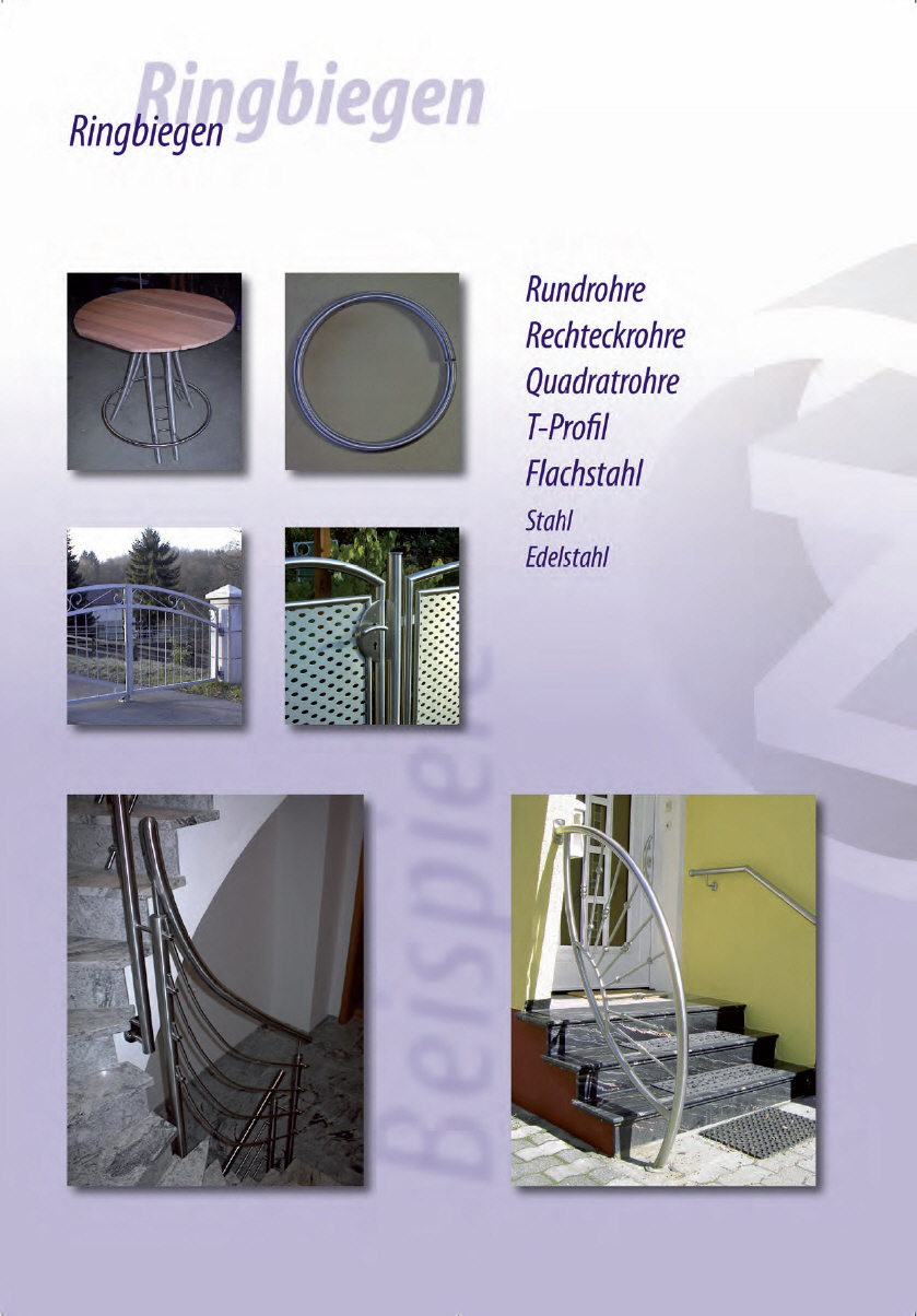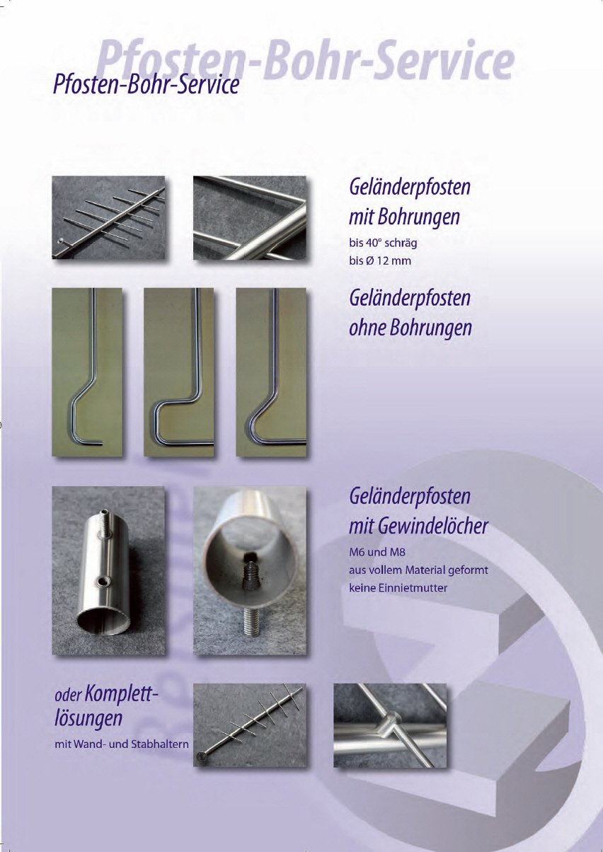 Dreiwalzenprofilbiegen: Wendelbiegen: zur Herstellung von gewendelten GeländerRingbiegen: zum Biegen von Torbögen, Ringen und gebogenen GeländerDornbiegen: zum Biegen von Geländerpfosten, Handläufe, Geländerfelder mit engen RadienPfosten-Bohr-Service: Hierbei werden Gewindelöcher aus Rohrmaterial geformt (keine Einnietmutter) Hier finden Sie unser aktuelles Prospekt [1.361 KB] für den Biegeservice.