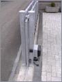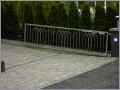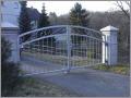 Rahmen aus Quadratrohr 40x40x2 mm. Füllung aus Zaunfeldern und Ø12 mm Rundstahl. Führungsschiene auf Bodenfundament verschraubt. Tor elektrisch betrieben.