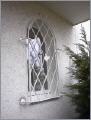 Rahmen aus gehämmerten Flachstahl 30 x 10 mm, Rautenfüllung aus Flachstahl 12 x 6 mm, Rautenverbindungen aus Bundeisen 20 x 4 mm, Wandanker aus Rundstahl Ø 16 mm gehämmert. Mit 2 Komponentenharz im Mauerharz verklebt. Schmetterlinge wurden aus altem Fenstergitter übernommen, sandgestraht und an neuem Gitter verschweißt.
